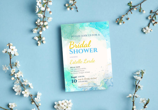 Alcohol Ink Bridal Shower Invite Template - Sky Ocean Blue Invite, Baby Shower Invite, Glittery confetti Gold