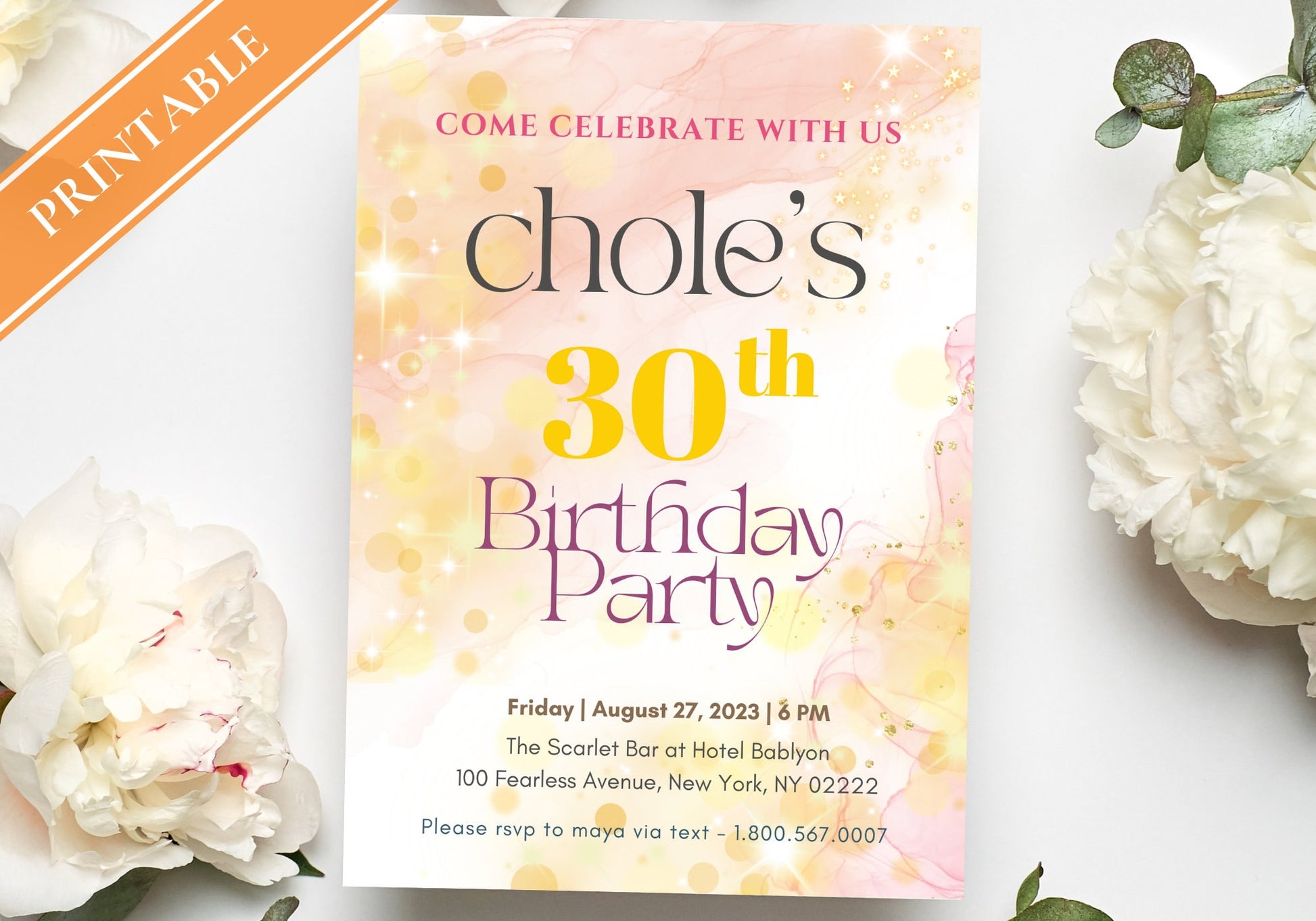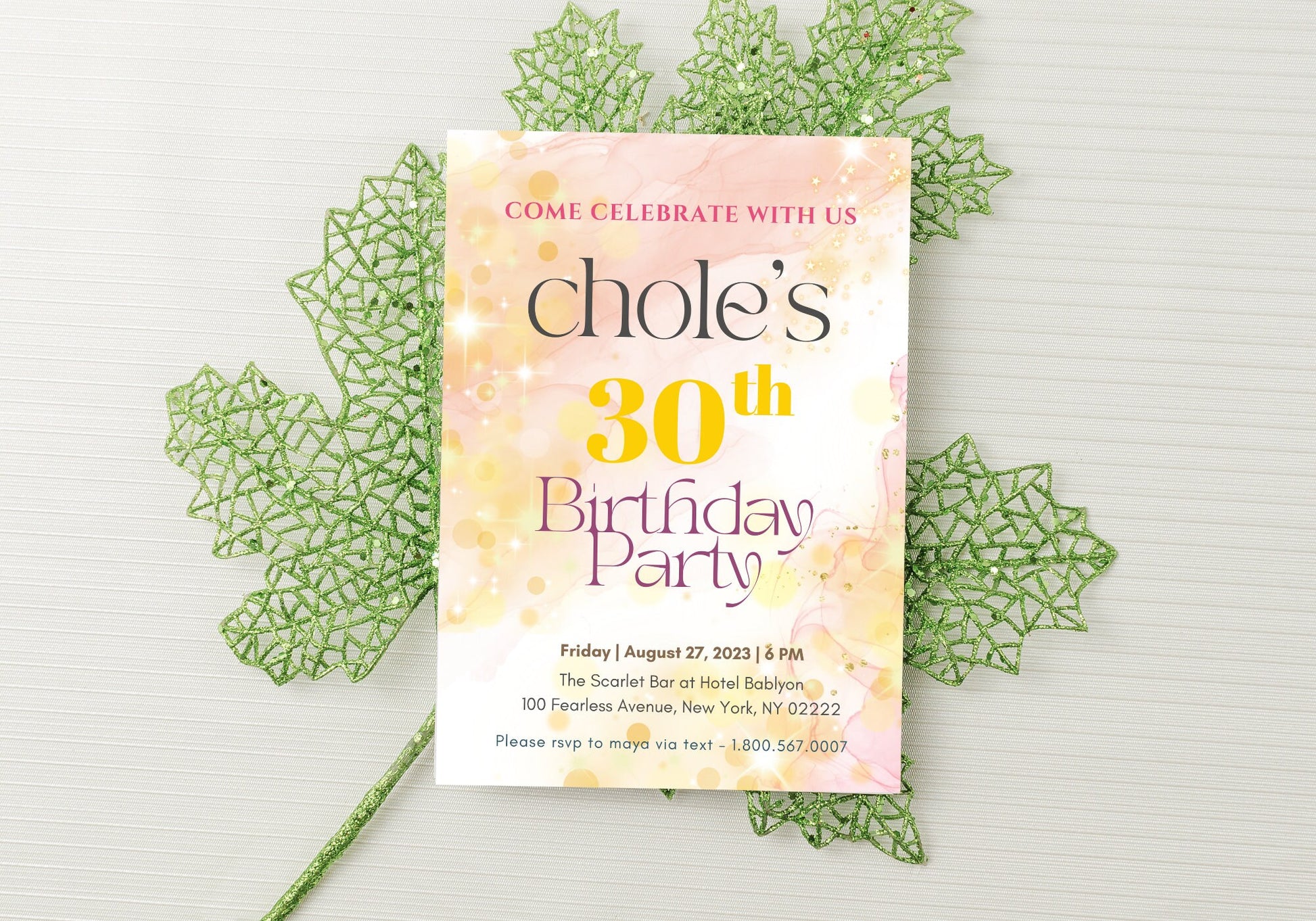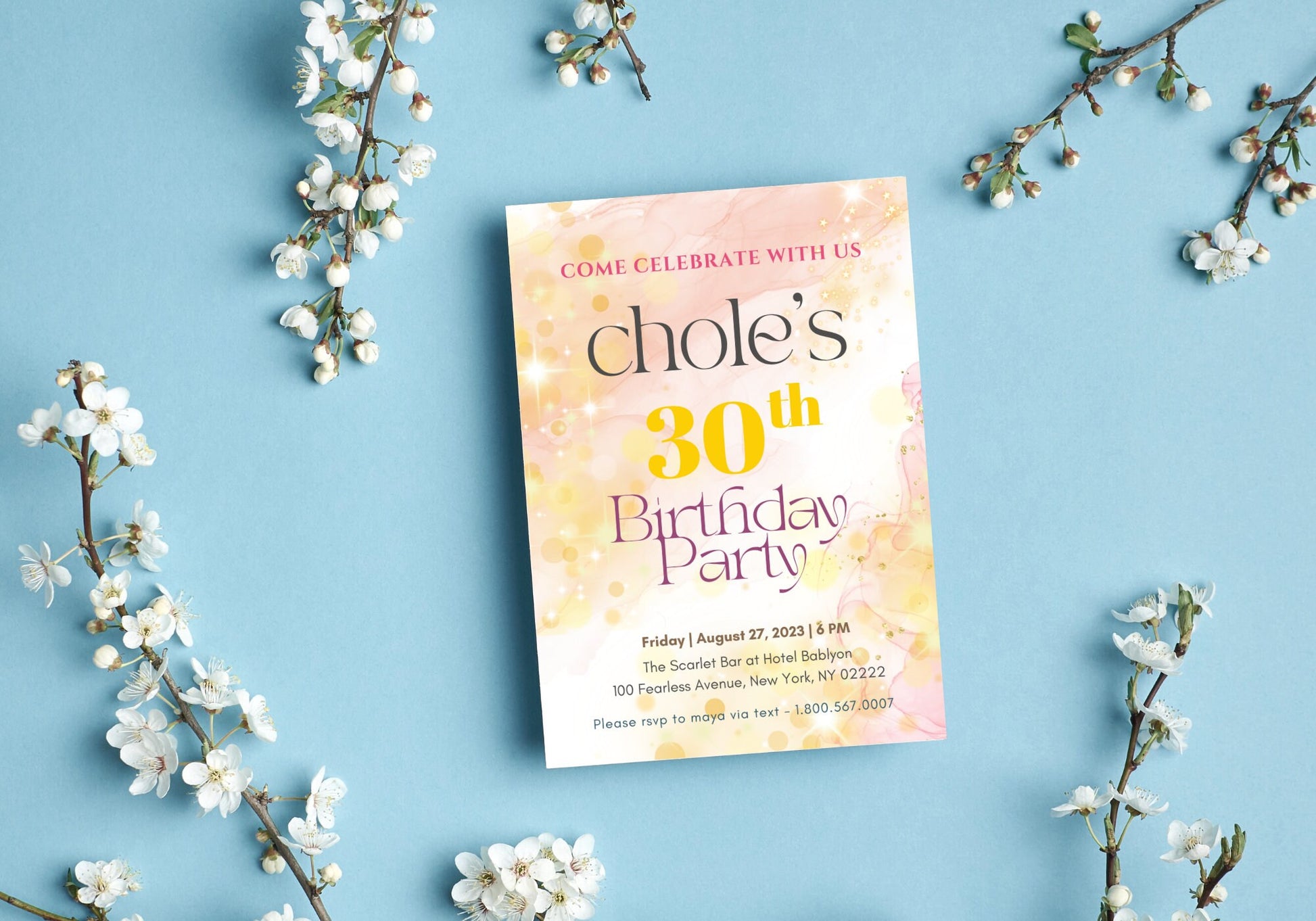 30th Party Invite Starry Alcohol Ink Birthday - 30th 40th 50th Birthday Dreamy Pink Peach Stars Glitter Gold Confetti