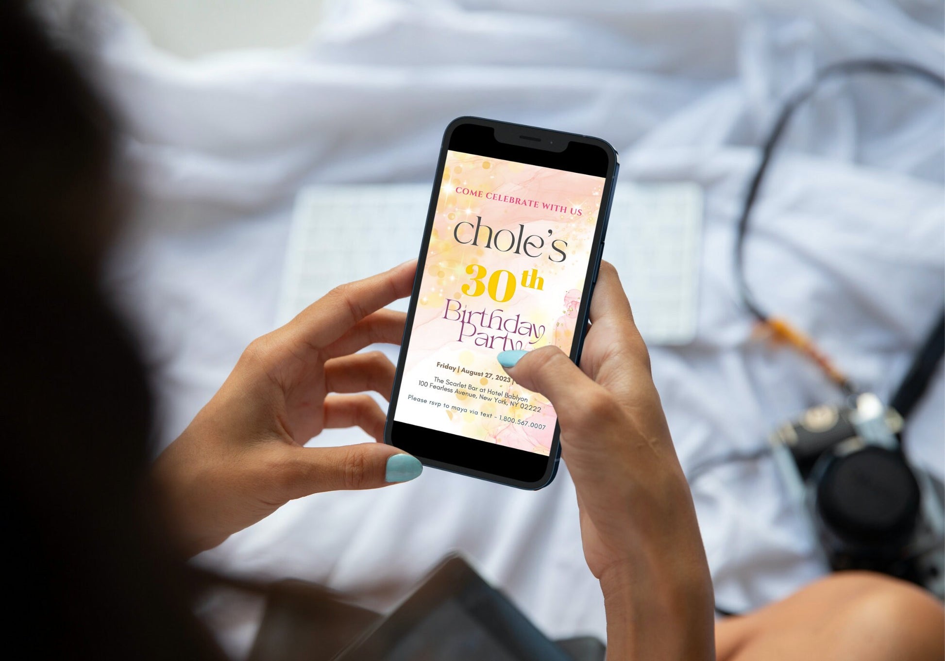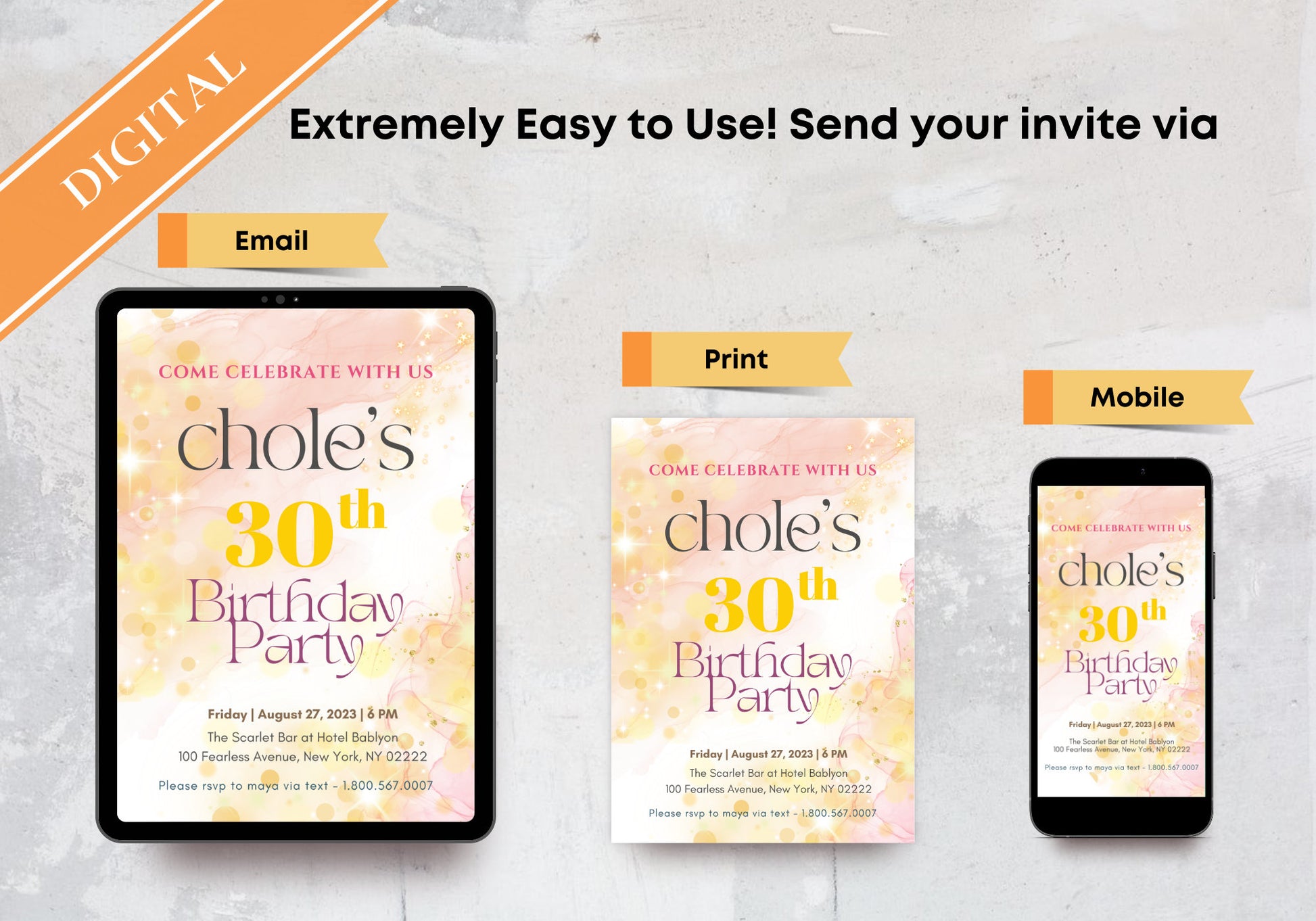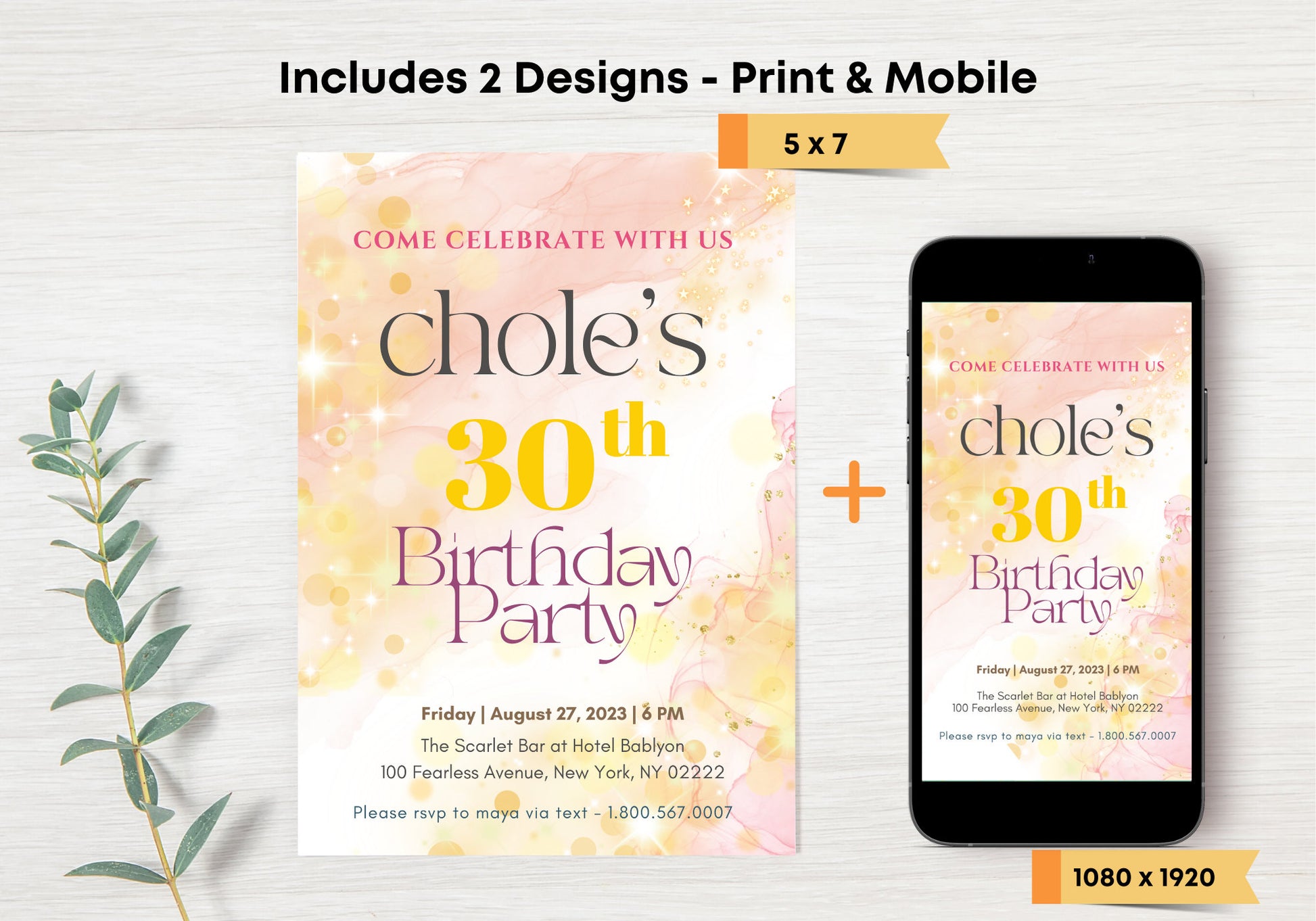 30th Party Invite Starry Alcohol Ink Birthday - 30th 40th 50th Birthday Dreamy Pink Peach Stars Glitter Gold Confetti