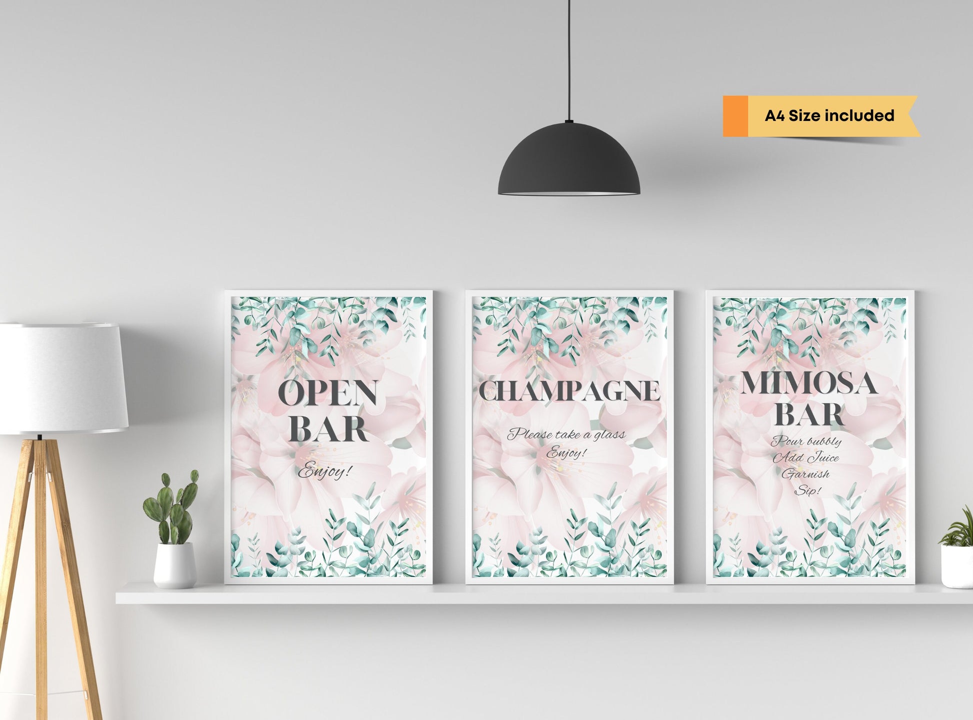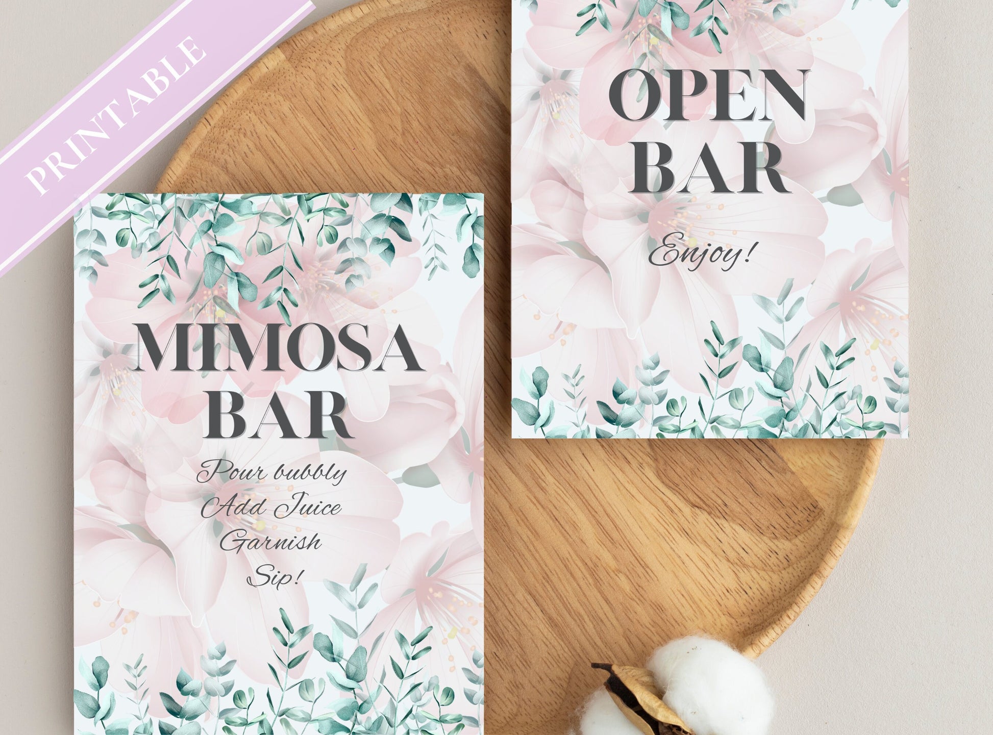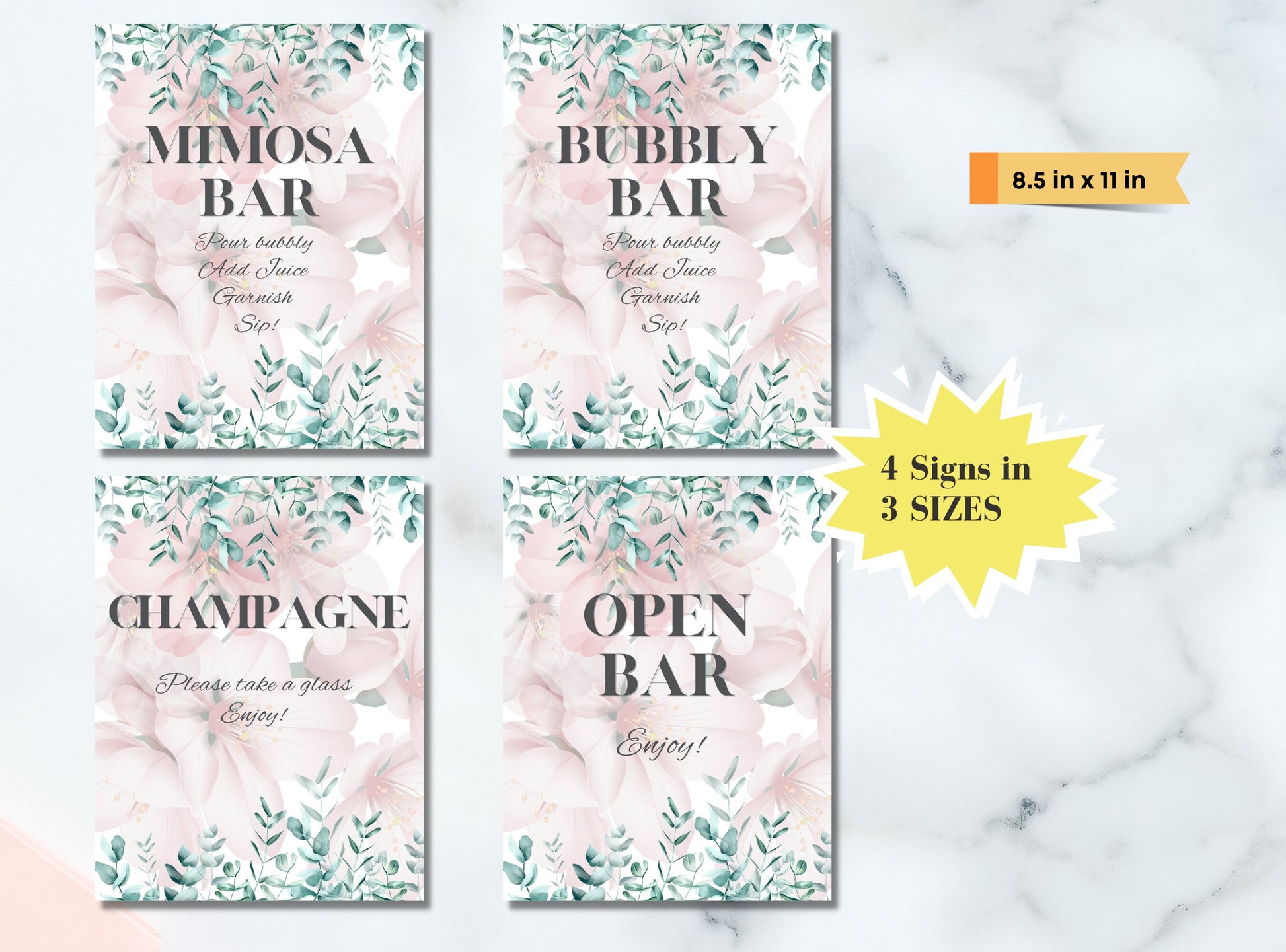 Modern Drink Menu Sign in Greenery with Pink Blooming Blossoms - Mimosa Bar, Champagne, Open Bar and Bubbly Bar Sign - this package includes All 4 Designs in 3 different sizes, Letter Size, A4 and 5 in x 7 in CARD size.