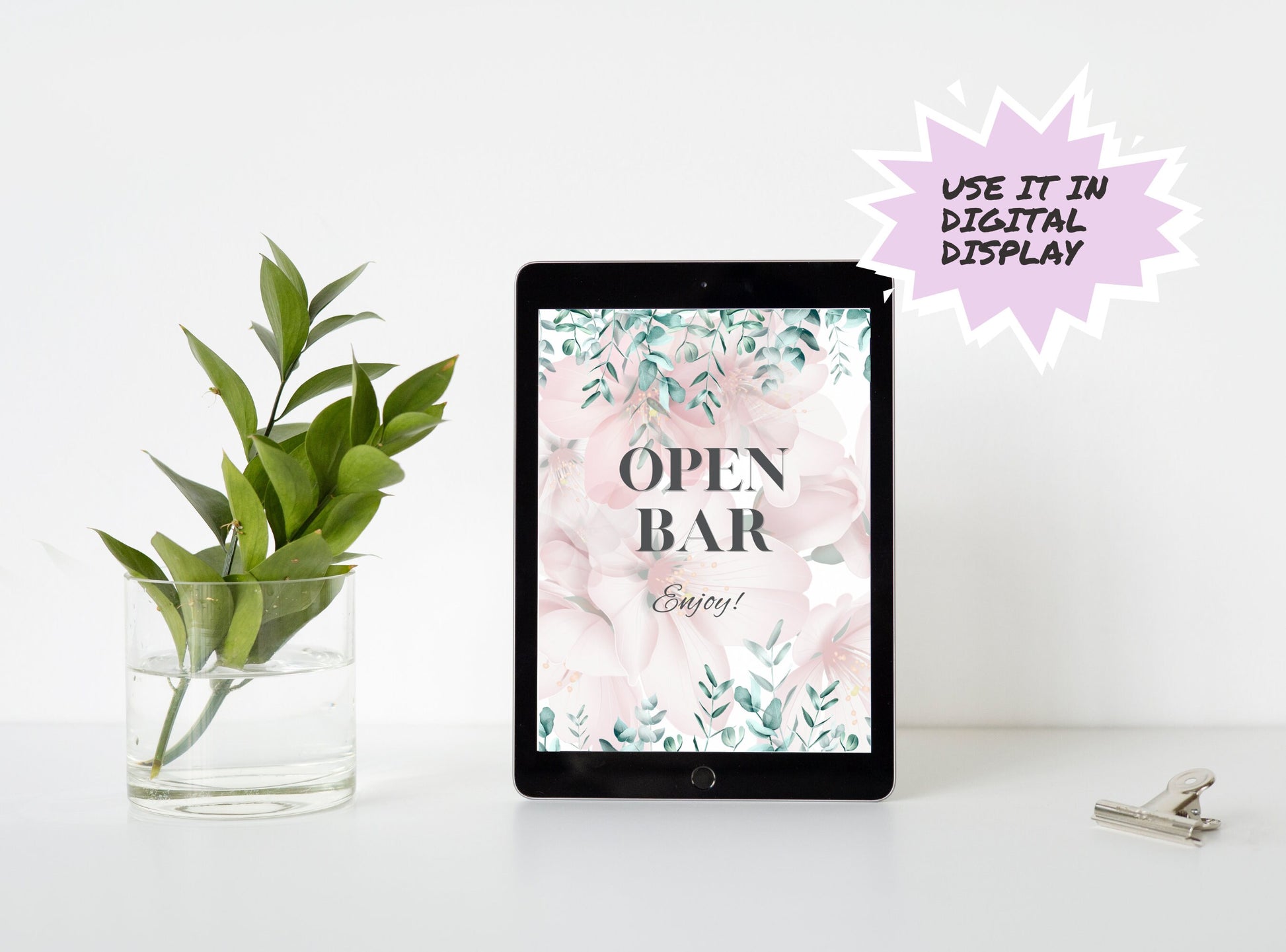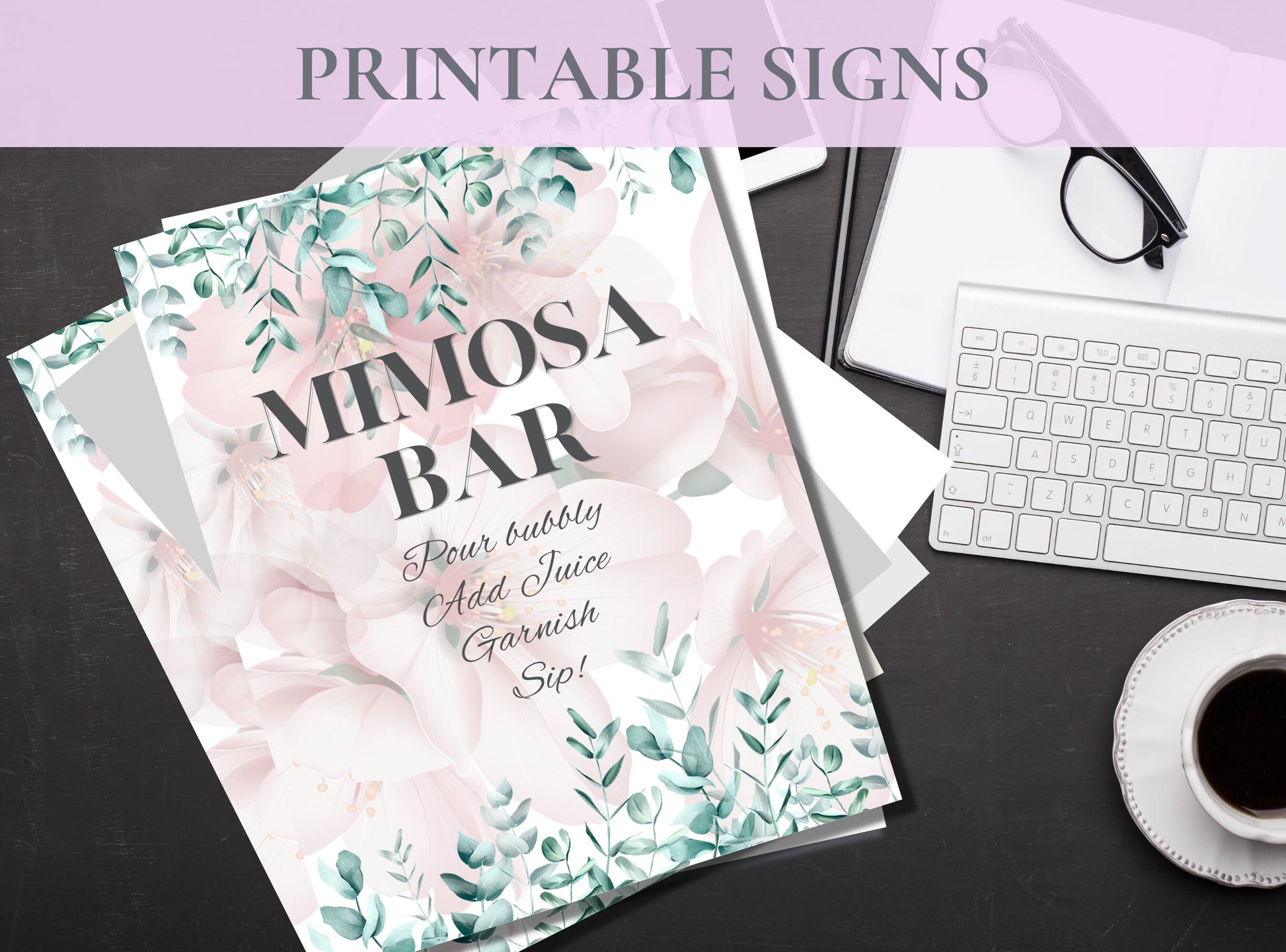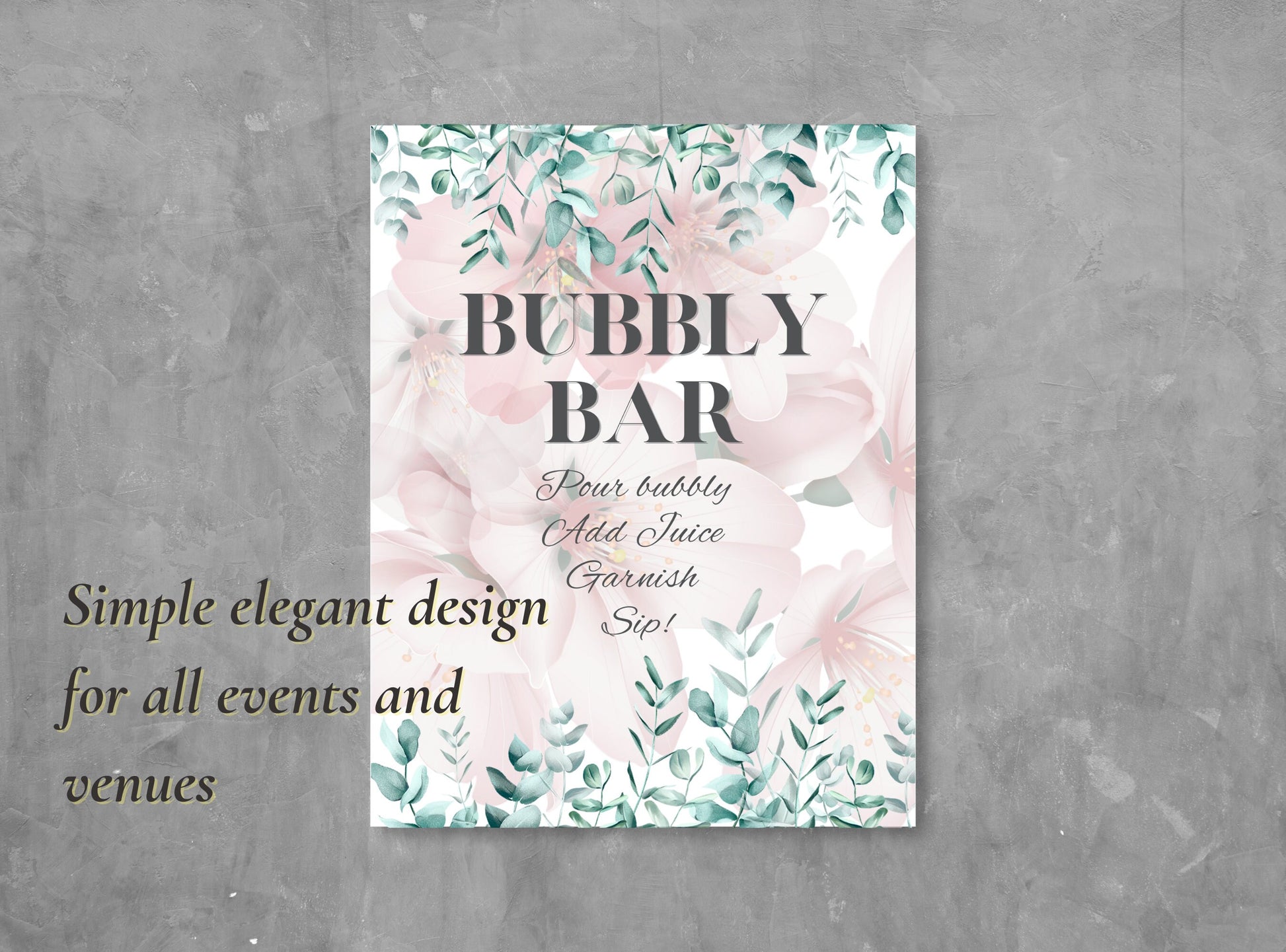 Modern Drink Menu Sign in Greenery with Pink Blooming Blossoms - Mimosa Bar, Champagne, Open Bar and Bubbly Bar Sign - this package includes All 4 Designs in 3 different sizes, Letter Size, A4 and 5 in x 7 in CARD size.